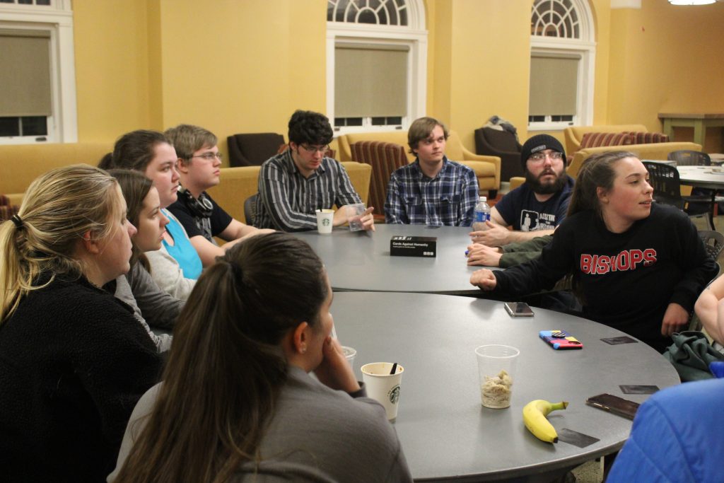 From left to right, OWU students Ariana Pantoja-Hyc, Madison Williams, Lauren Mangold, Kaitie Welch, Parker Siegfried, Stephen Kostman, Ryder Beckman, Cade Campanale, Stephen Gagne, and Madeline Rea play a game of Werewolf.
